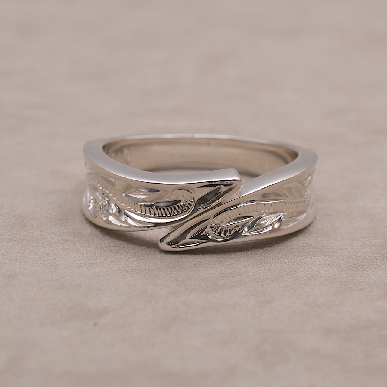 リング全体に刻まれたスクロール(波)は、永遠の愛と幸せを象徴するハワイ伝統のモチーフ。