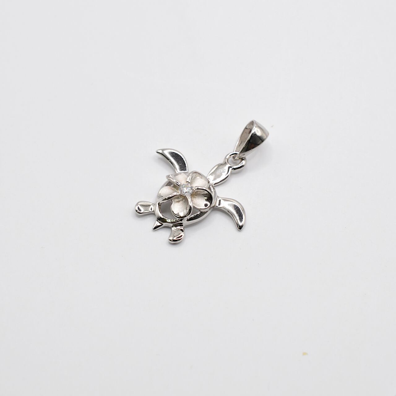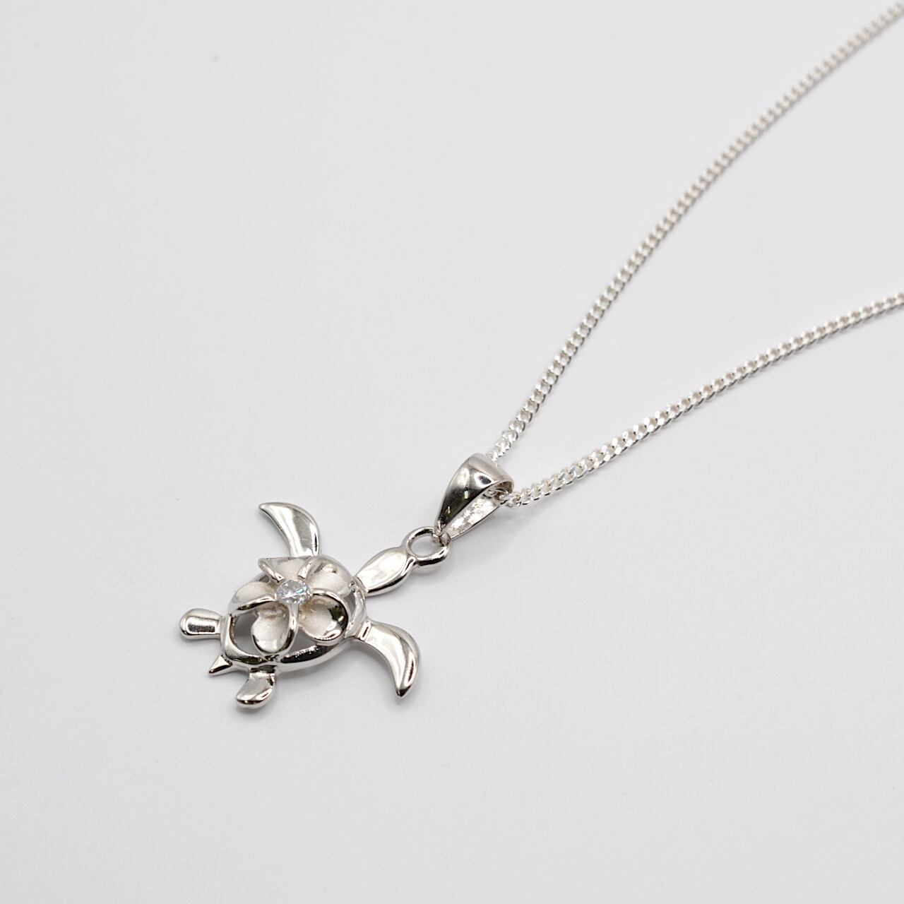 ホヌ(海亀)モチーフのペンダント ホヌの背にプルメリアがデザインされた ペンダントになります。 *プルメリアの花芯にはジルコニア ペンダント Size 縦 :15㎜ 横 :17㎜ 素材:silver 925 石:キュービックジルコニア ◆画像のsilverチェーンは含まれておりません。 ◆2.5㎜のSTAINLESSチェーンは付属します(長さ:50㎝)