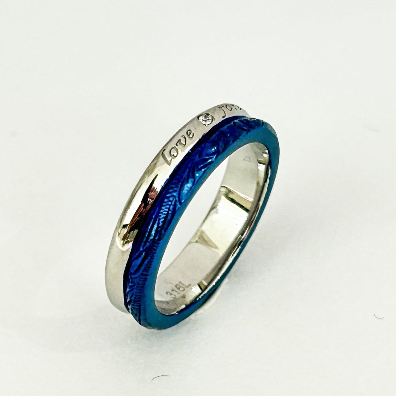 ブルー & スティールカラー 彫デザイン:スクロール(波) 素材:サージカルステンレス316L (金属アレルギー対応) Size 幅 4 mm Size 厚み 1.5mm ※金属アレルギーの方もご安心してご利用頂けます。 【スクロール(波)】 寄せては返す途切れる事のない美しい波は 永遠とも呼び幸せを運び続けてくれるという意味があります。