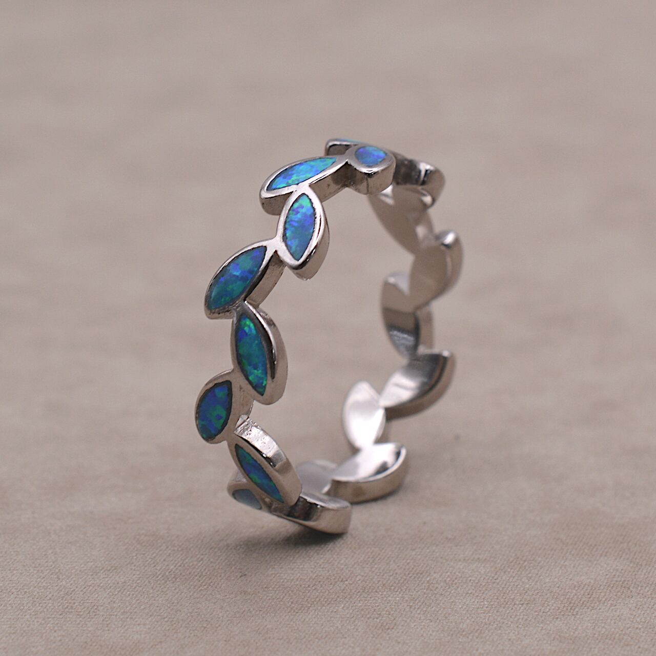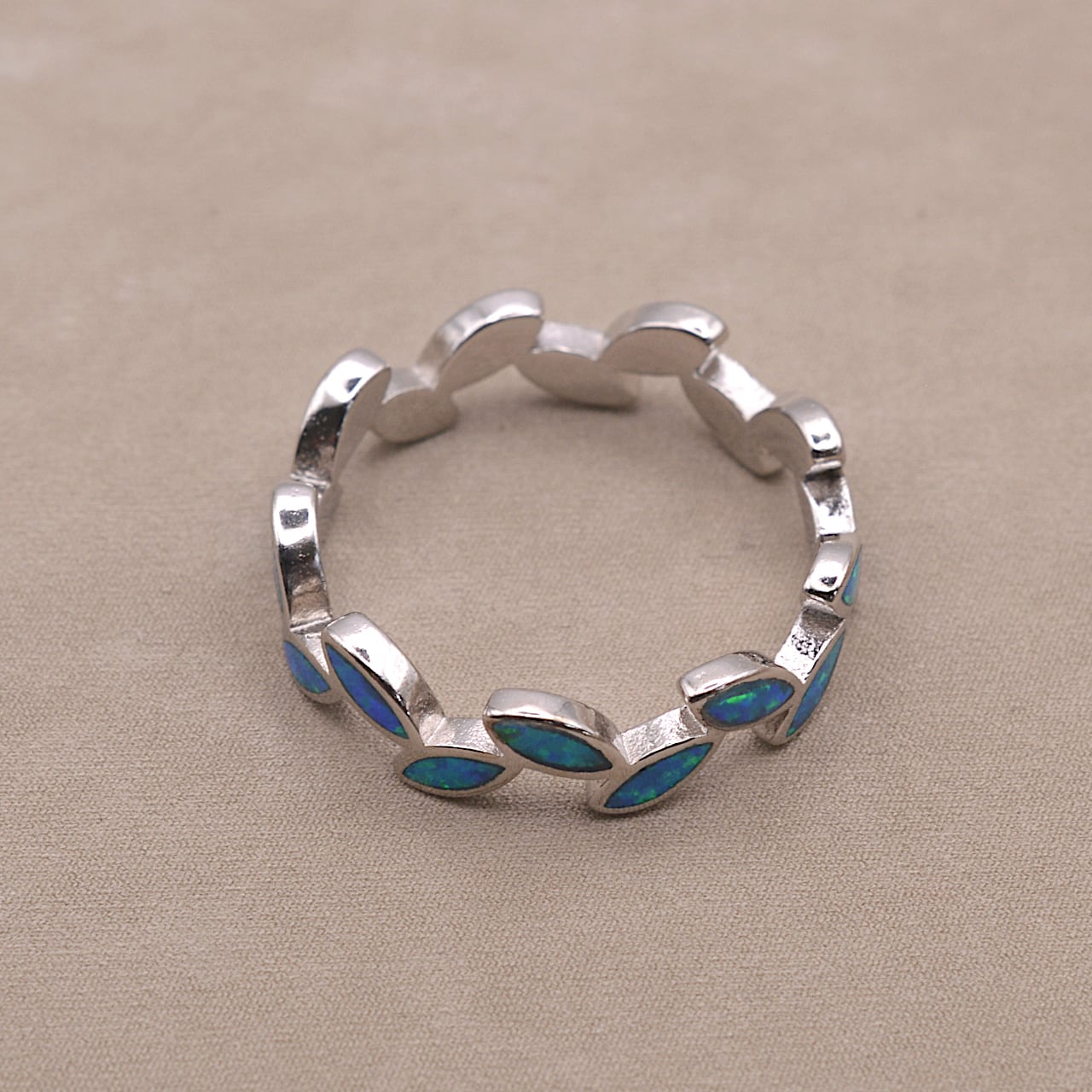 神聖なマイレ模様をあしらったシンセティックブルーオパールリング。