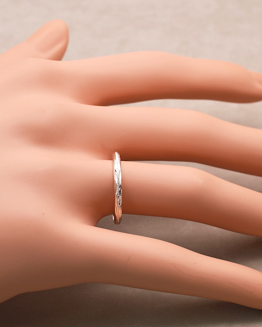 ハワイアンジュエリーの伝統的なモチーフ「スクロール(波)」を、日常に溶け込む2mm幅の華奢なフォルムに凝縮しました。熟練した職人の手彫りによって刻まれた波の模様は、光を受けるたびにキラキラと繊細に煌めき、あなたの指先を一段と美しく、上品に引き立てます。