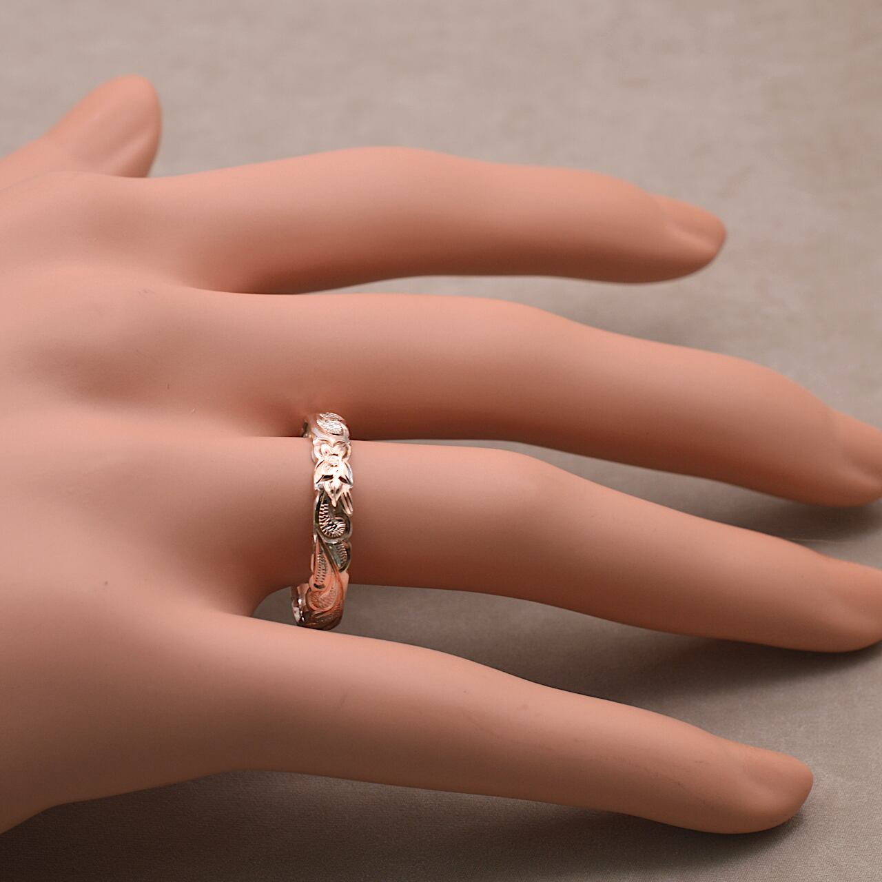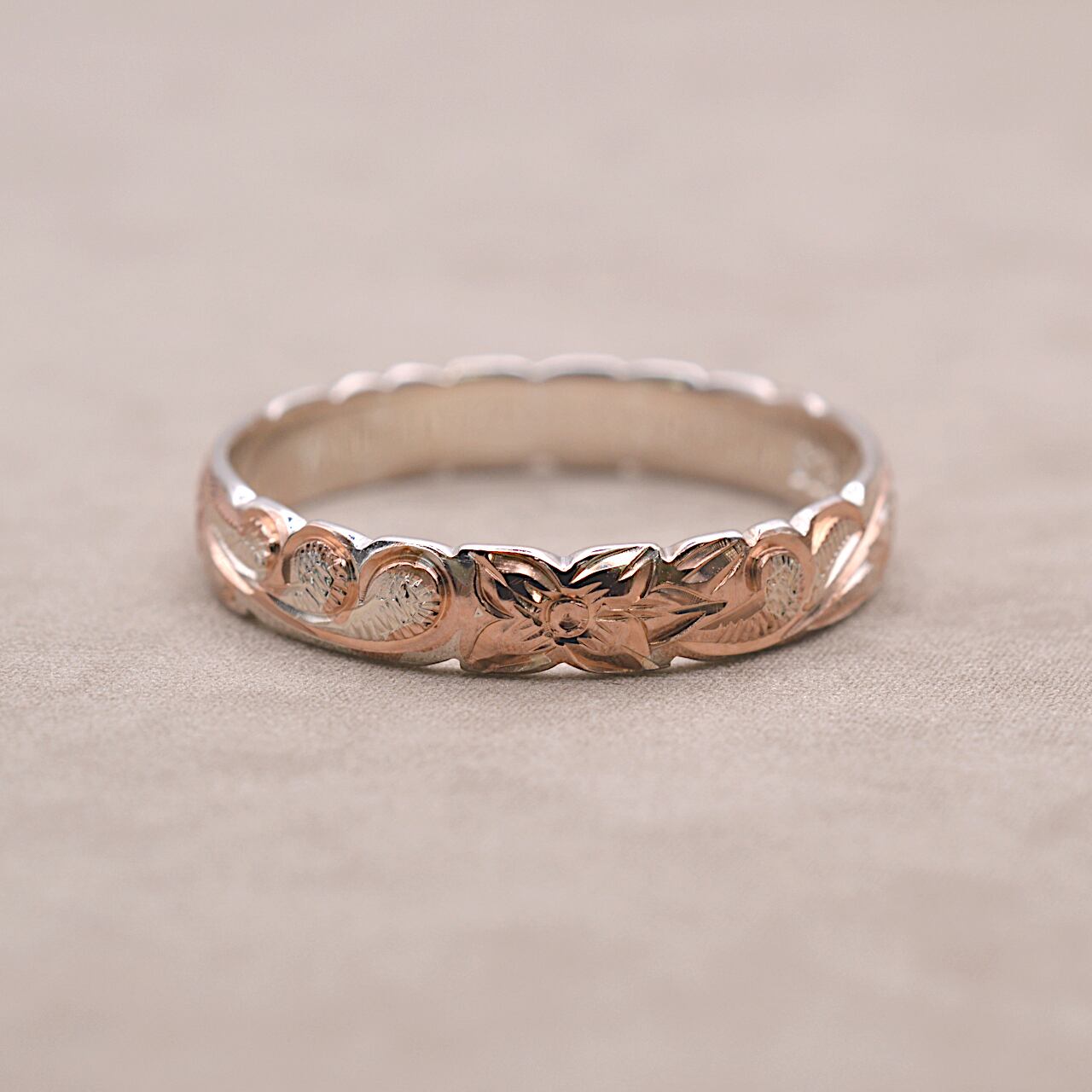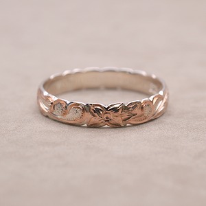 リング全体に施された繊細なハワイアンスクロール(波)の彫りが、上品な存在感を放ちます。