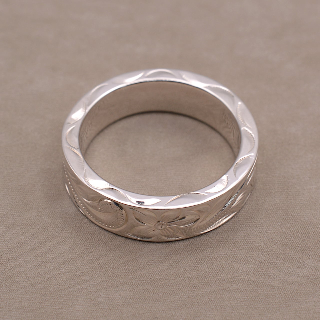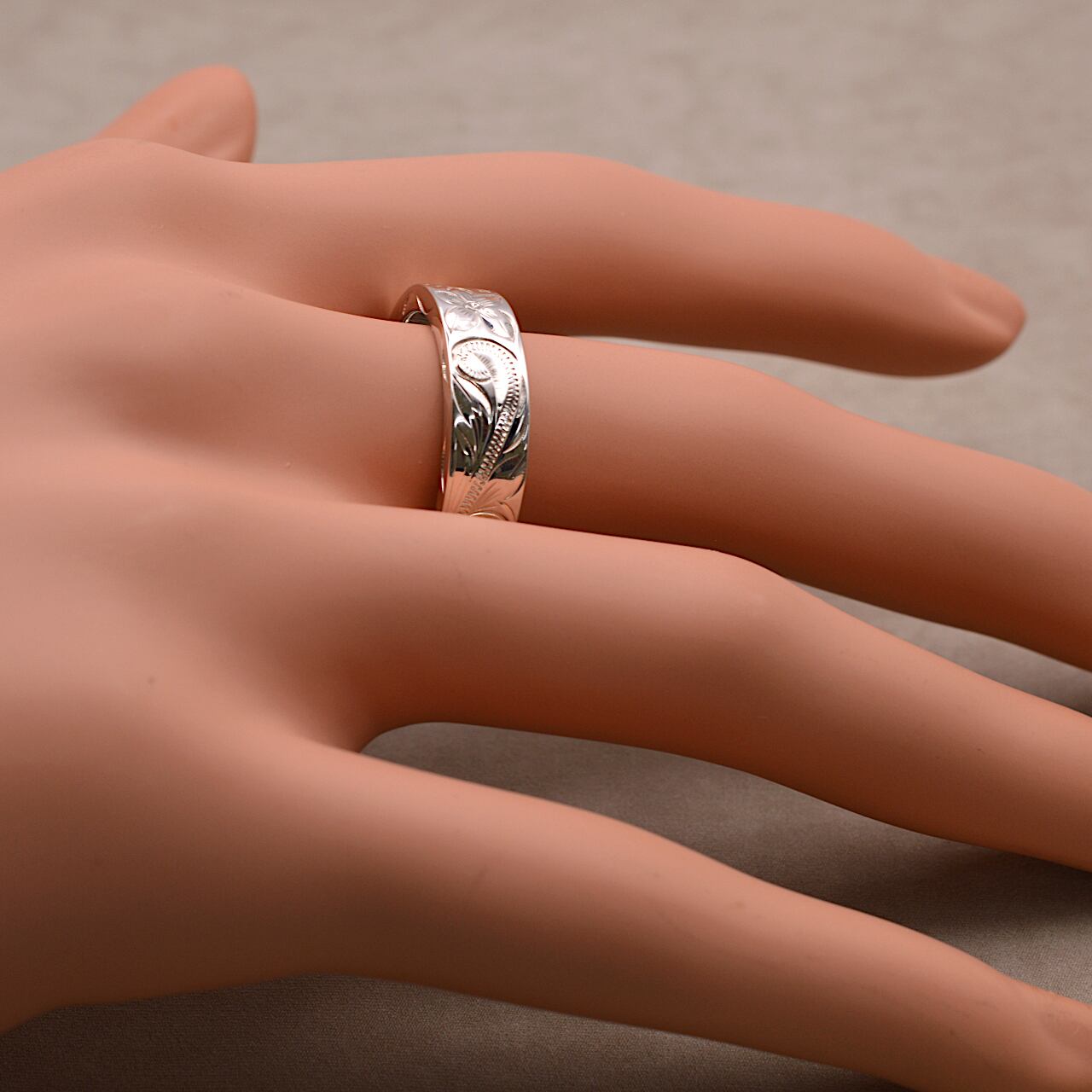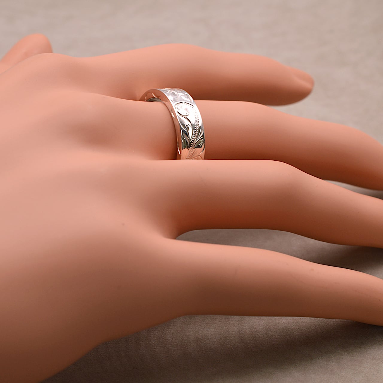 リング全体にはハワイ伝統のスクロール(波)模様が丁寧に彫り込まれ