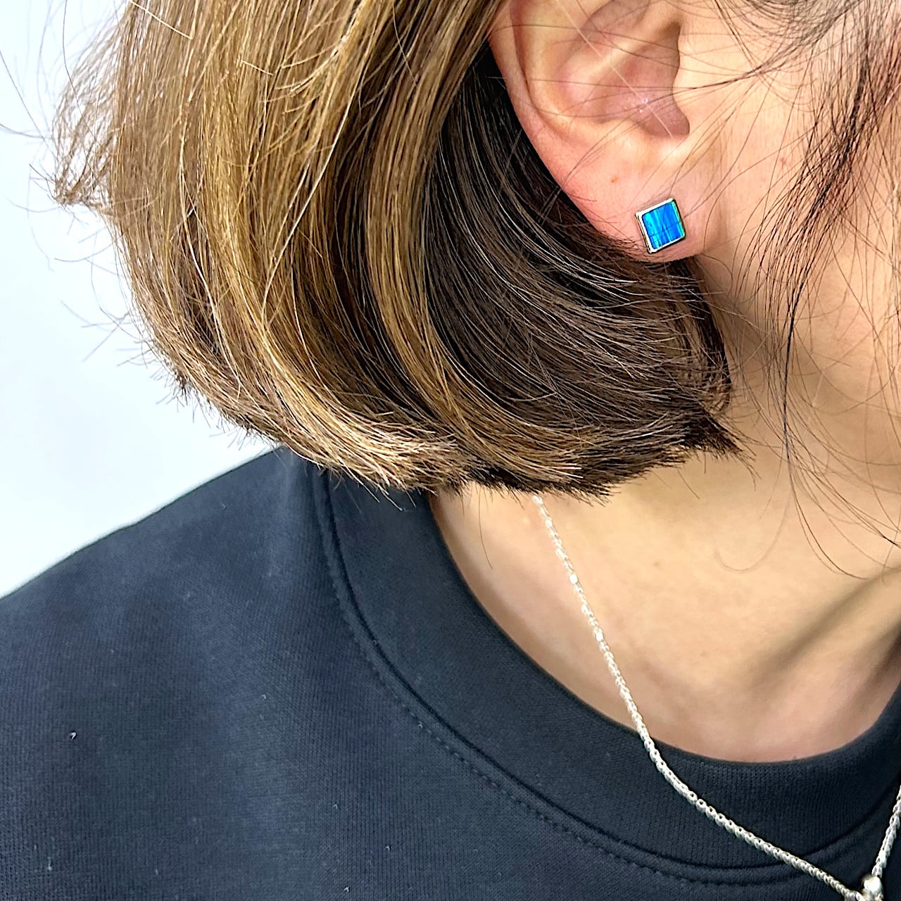 7mm × 7mm の程よいサイズ感の中に、シンセティックオパールの揺らめく光を閉じ込めました。