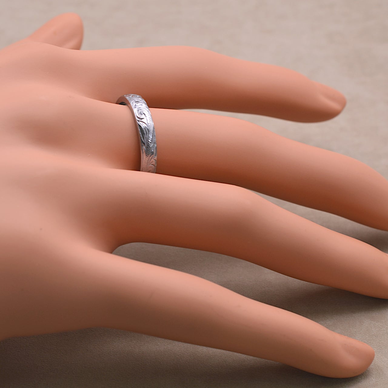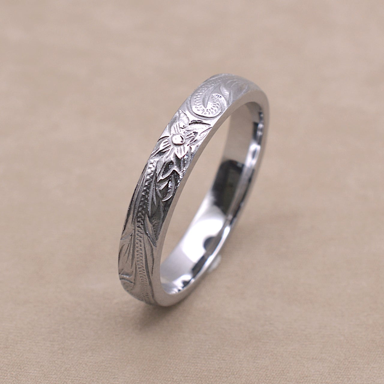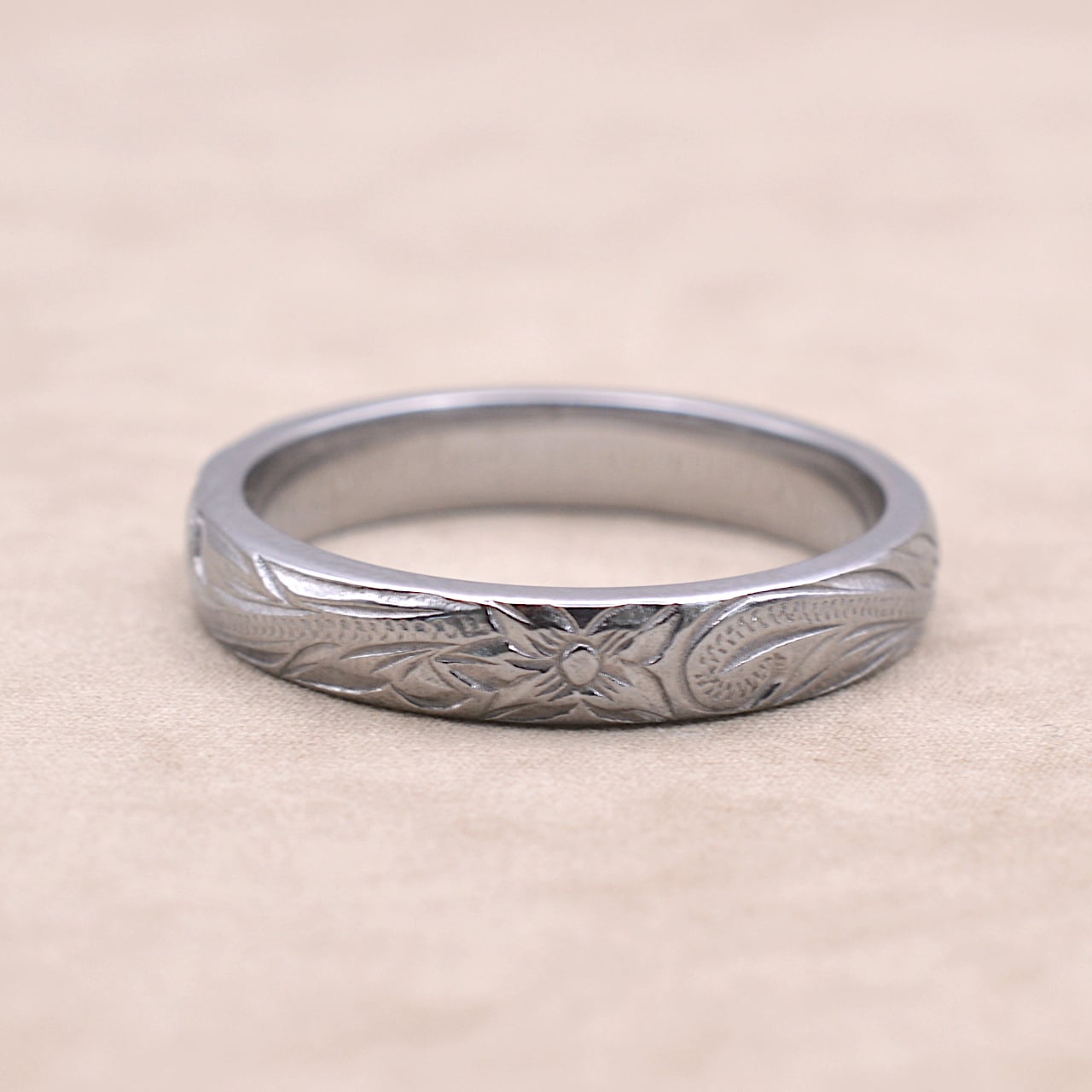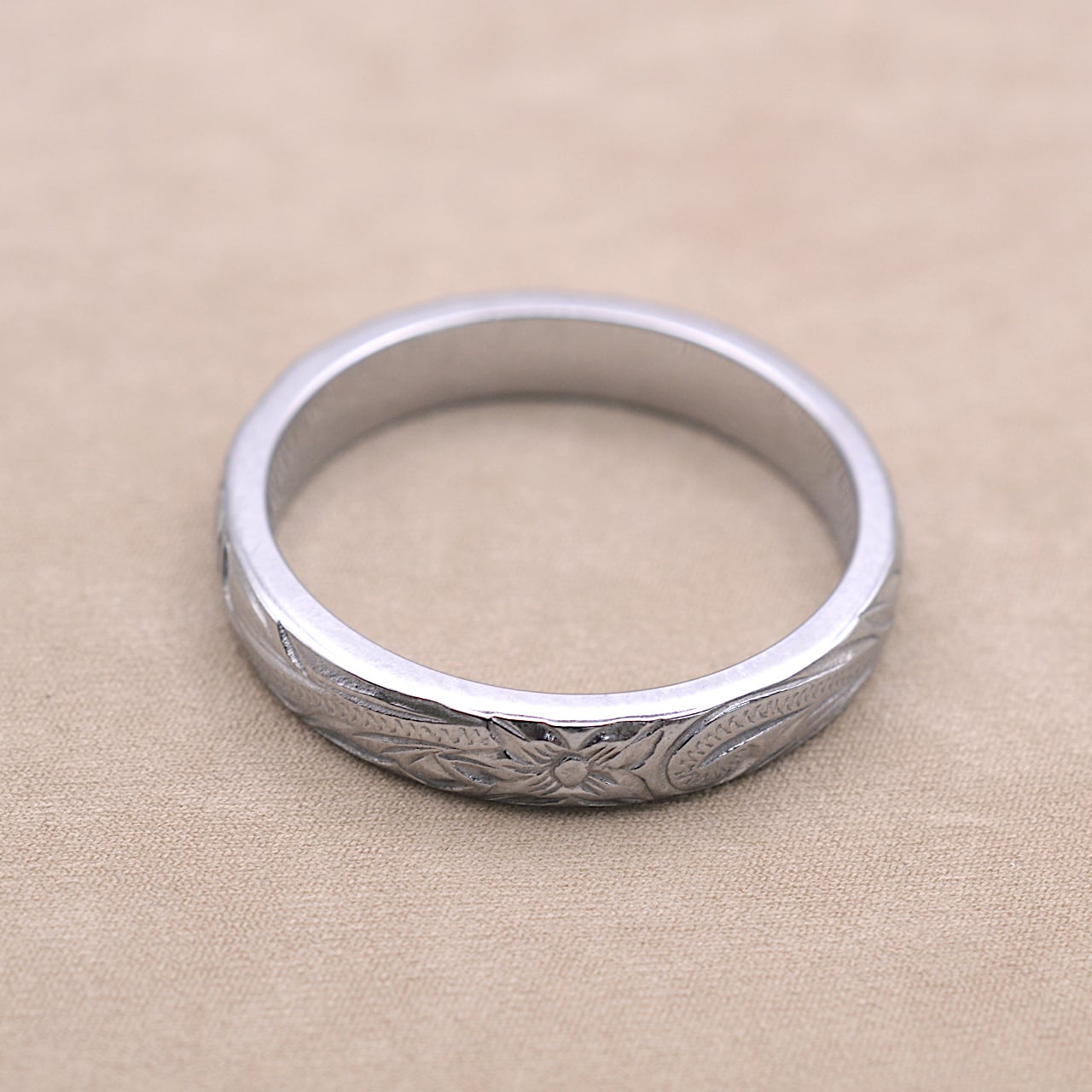 4㎜幅 スティールカラー 彫デザイン:スクロール(波) プルメリア 素材:サージカルステンレス316L (金属アレルギー対応) Size 幅 4㎜ Size 厚み 1.7㎜ ※金属アレルギーの方もご安心してご利用頂けます。 税込価格¥8,800