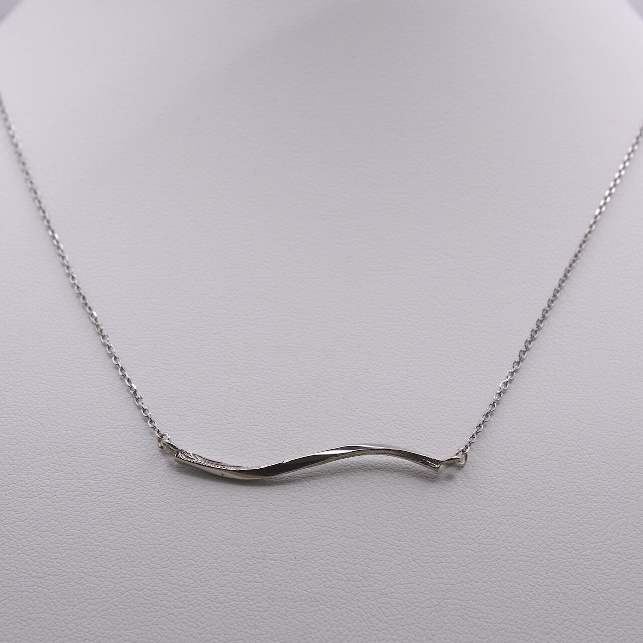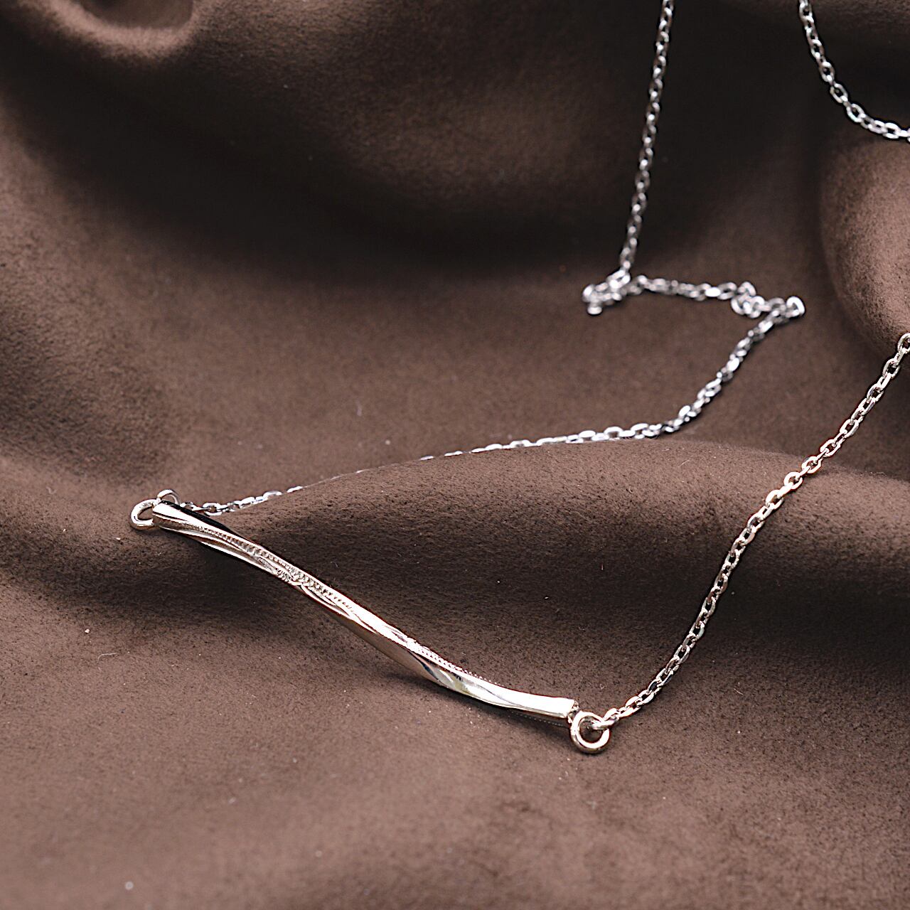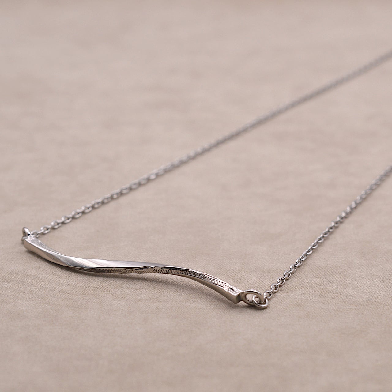 横長のツイストバーにスクロールデザインを施した、ステンレス素材のネックレス。
