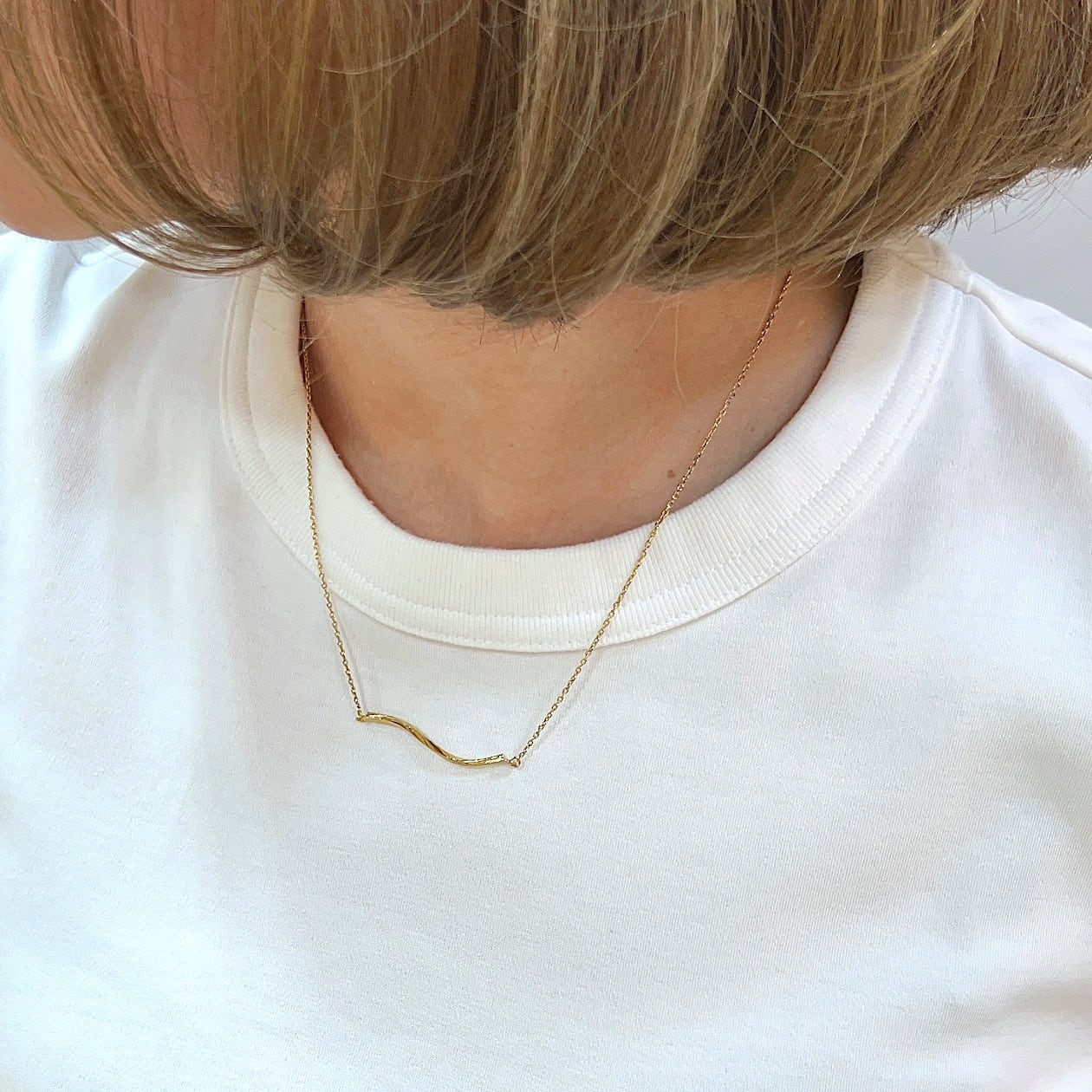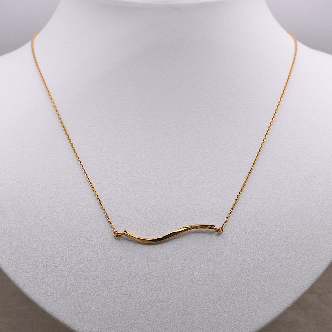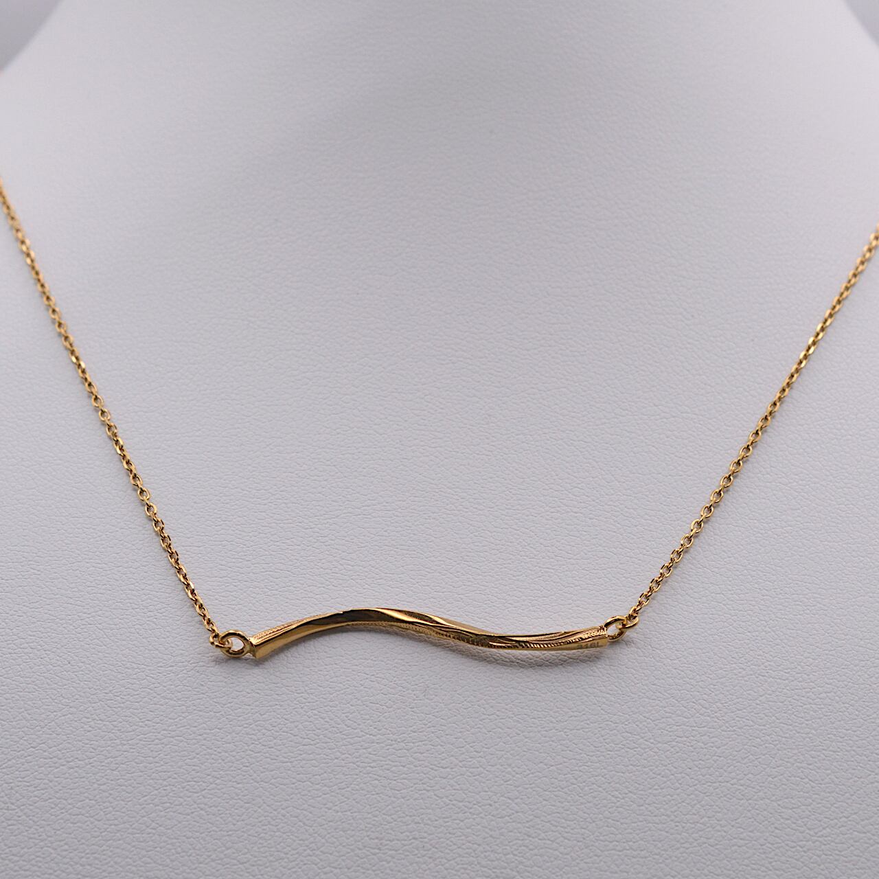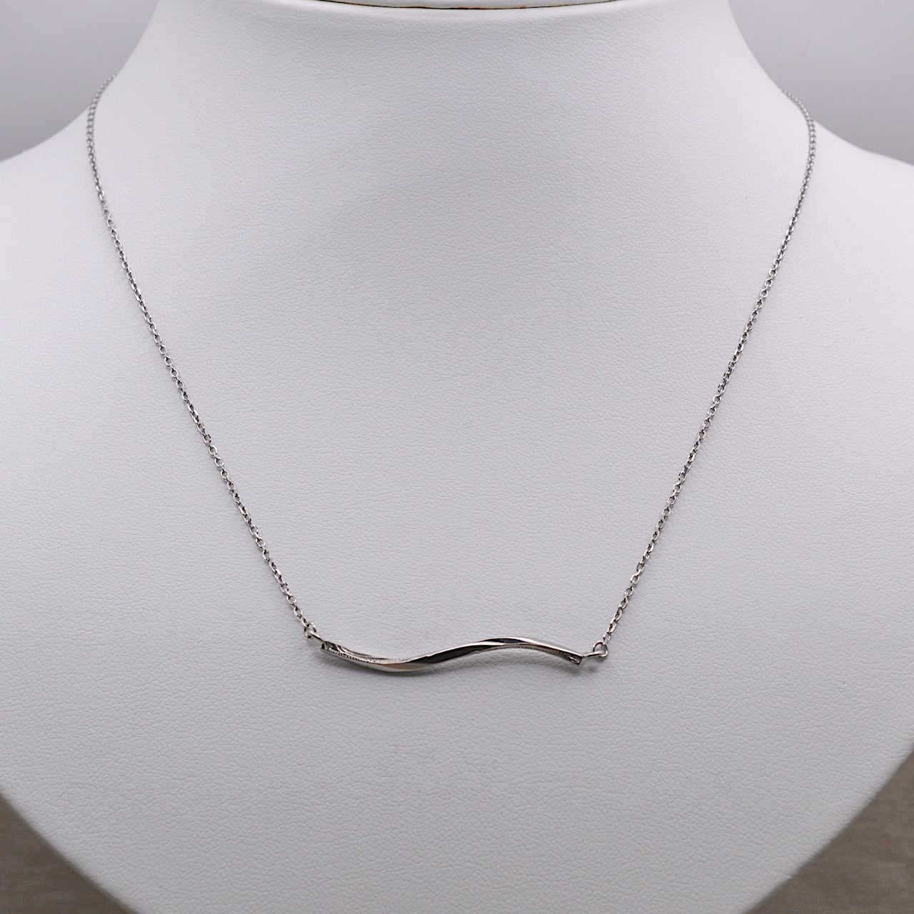 横長のツイストバーにスクロールデザインを施した、ステンレス素材のネックレス。