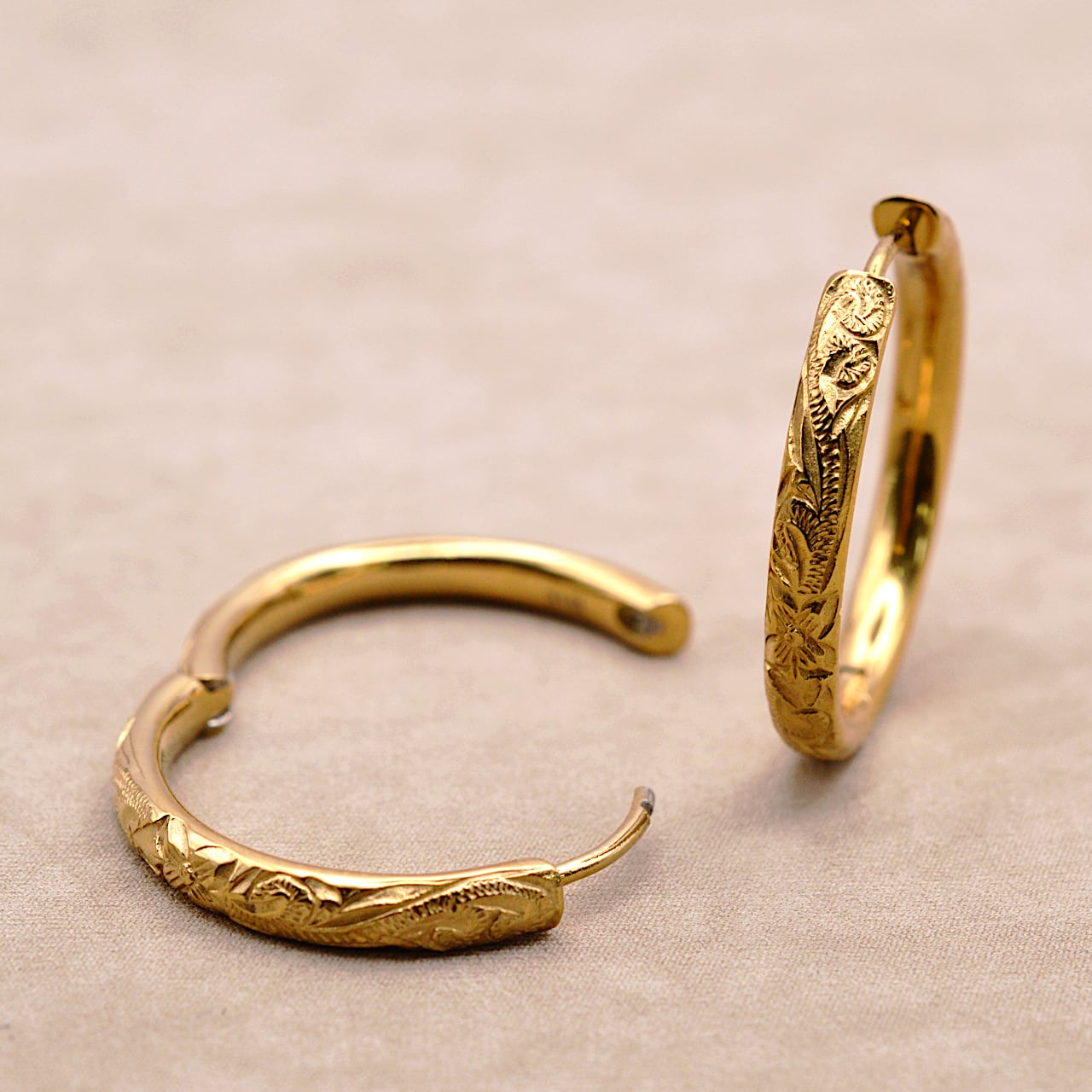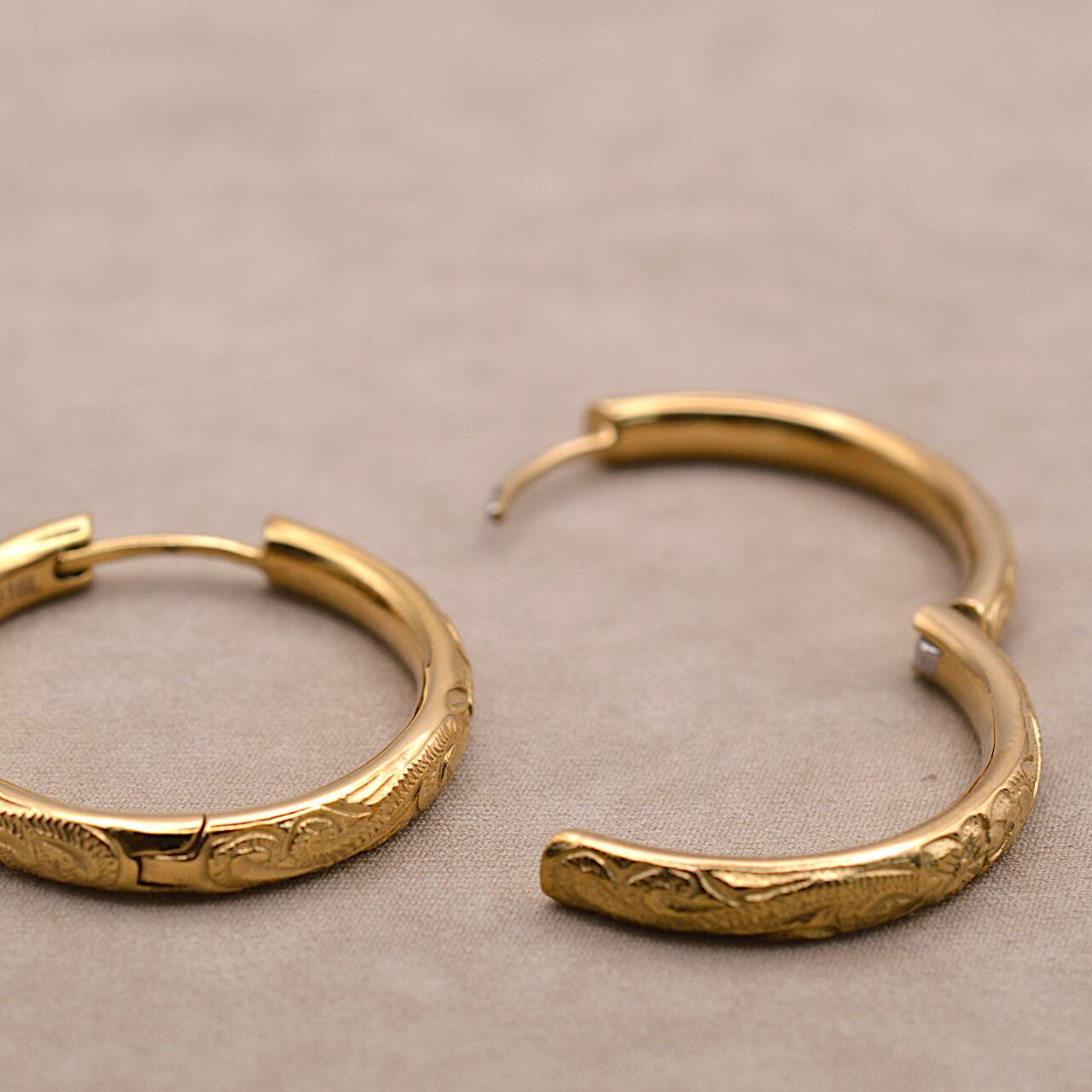 繊細なスクロール彫りを施した22㎜フープピアス。