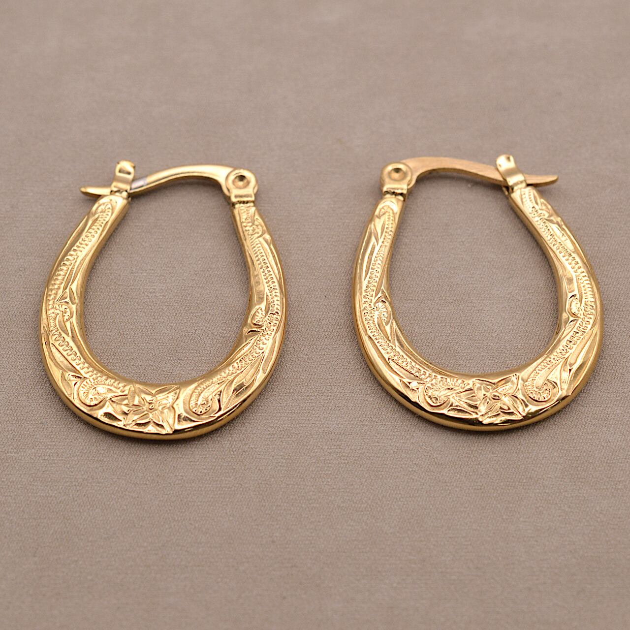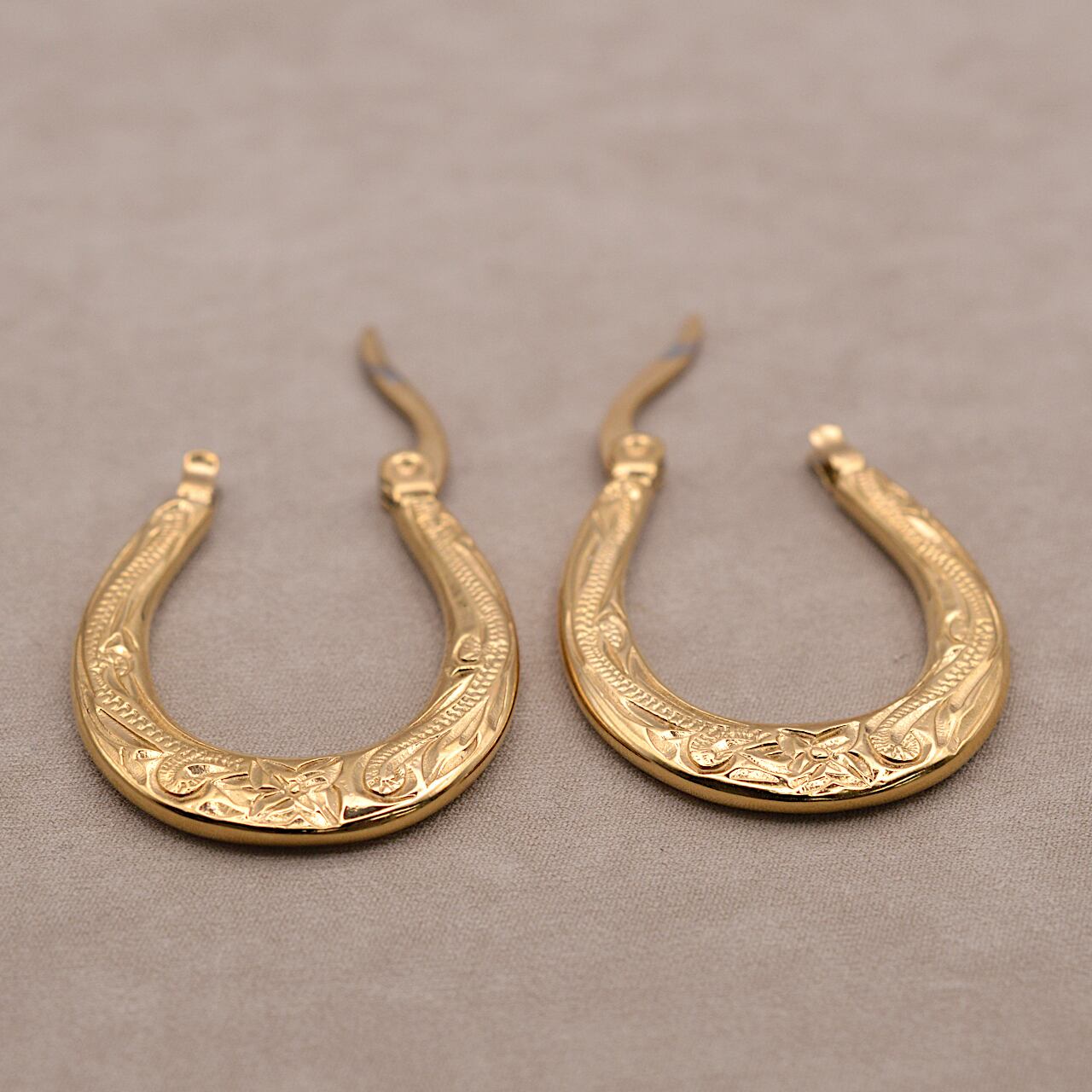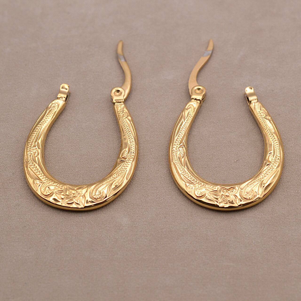 縦25㎜・奥行き18㎜の立体感あるフォルムに、両面へ贅沢に施されたスクロール彫りが、耳元に深い輝きを宿します。