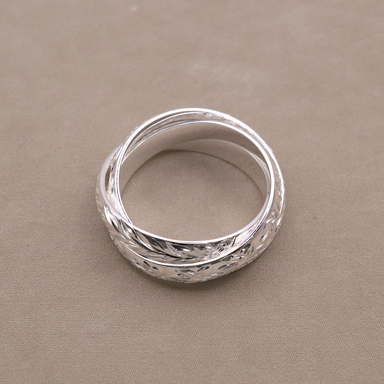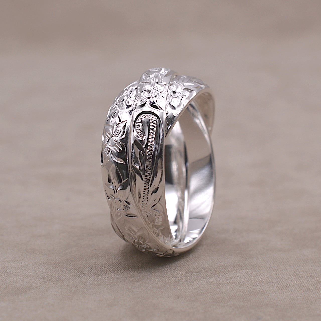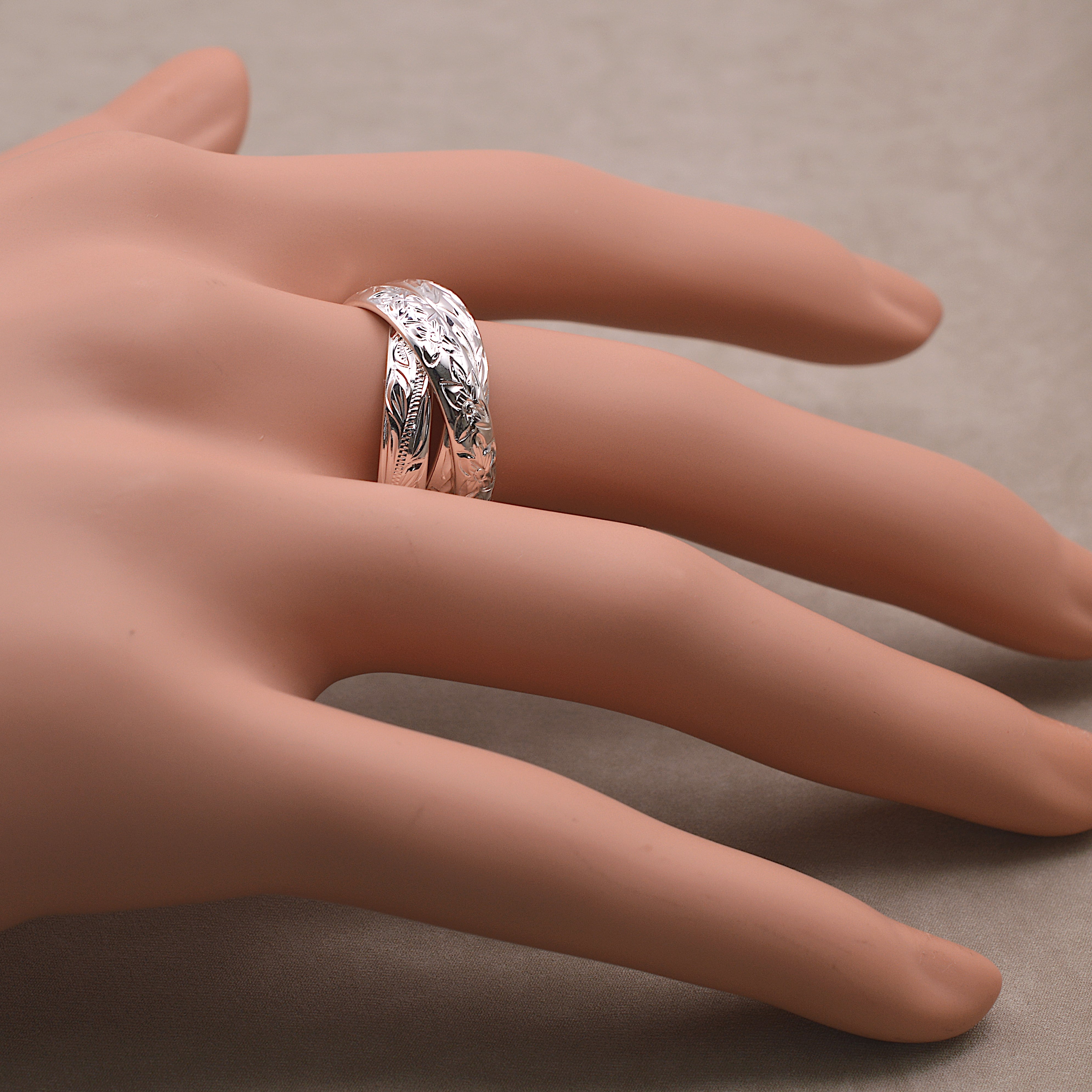 それぞれのリングには、ハワイアンジュエリーを代表するモチーフが1周に彫り込まれています。